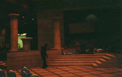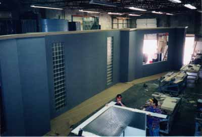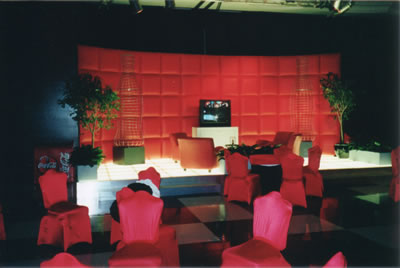 Right side of huge corporate set with stucco columns, walls, and large dimensional crown including podium and scenic paint. Sold   Coke Corporate Theme PartyCoke called me and wanted something different! We used red vinyl walls to surround the under lit plexi dance floor with metal mica sides and steps leading to the gray and black vinyl gloss flooring.