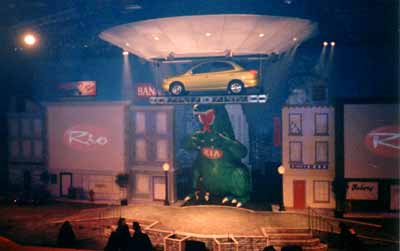 | Home Portfolio Inventory Art Galleries Broad and Cassel Children's Shows Churches Concert / Staging Corporate Sets / Business Theatre Disney Conference Room Exteriors Flooring Futuristic Set Game Shows Gaylord Palms High End Wood & Laminate Interiors JW Marriott Misc. Props Ripley's San Antonio Ripley's Time Square Scenic Painting Sculpted Sets Sesame Street Talk Show / News Anchor Set Theme / Amusement Parks Theme Party Sets Toys R Us Trade Show / Displays Wild Shapes |   Futuristic Set  SchweppsWhen we were approached by Schweppes to do a new age high tech looking oversized bar for a 2.1 million dollar commercial with the largest cast of animal actors ever used in Orlando, we were delighted to oblige with this huge 26' x tall 72' wide x 52' deep oval set with textured 4 x 4 stone flooring green granite walls, huge tapered columns and real upholstered vinyl oversized booths. And a lot of sculpted props and custom furniture. Not to mention the 50 x 100 x 1' pool we built between Nickelodeon Studios and Hard Rock Cafe with a 50x 100 bluescreen and custom built dock, deck house and furniture. Rent some of this set for your next feature. See next picture.  SchweppsWhen we were approached by Schweppes to do a new age high tech looking oversized bar for a 2.1 million dollar commercial with the largest cast of animal actors ever used in Orlando, we were delighted to oblige with this huge 26' x tall 72' wide x 52' deep oval set with textured 4 x 4 stone flooring green granite walls, huge tapered columns and real upholstered vinyl oversized booths. And a lot of sculpted props and custom furniture. Not to mention the 50 x 100 x 1' pool we built between Nickelodeon Studios and Hard Rock Cafe with a 50x 100 bluescreen and custom built dock, deck house and furniture. Rent some of this set for your next feature. See next picture.  SchweppsWhen we were approached by Schweppes to do a new age high tech looking oversized bar for a 2.1 million dollar commercial with the largest cast of animal actors ever used in Orlando, we were delighted to oblige with this huge 26' x tall 72' wide x 52' deep oval set with textured 4 x 4 stone flooring green granite walls, huge tapered columns and real upholstered vinyl oversized booths. And a lot of sculpted props and custom furniture. Not to mention the 50 x 100 x 1' pool we built between Nickelodeon Studios and Hard Rock Cafe with a 50x 100 bluescreen and custom built dock, deck house and furniture. Rent some of this set for your next feature. See next picture.  SchweppsWhen we were approached by Schweppes to do a new age high tech looking oversized bar for a 2.1 million dollar commercial with the largest cast of animal actors ever used in Orlando, we were delighted to oblige with this huge 26' x tall 72' wide x 52' deep oval set with textured 4 x 4 stone flooring green granite walls, huge tapered columns and real upholstered vinyl oversized booths. And a lot of sculpted props and custom furniture. Not to mention the 50 x 100 x 1' pool we built between Nickelodeon Studios and Hard Rock Cafe with a 50x 100 bluescreen and custom built dock, deck house and furniture. Rent some of this set for your next feature. See next picture.  1999 KIA Corporate Show5'tall x 30' diameter flying saucer with directional down lights, lasers, rope lighting, and a 7 x 15 center platform that can be lowered independently from saucer! Great piece loads in quickly!