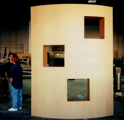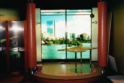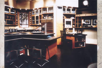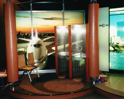 | Home Portfolio Inventory Art Galleries Broad and Cassel Children's Shows Churches Concert / Staging Corporate Sets / Business Theatre Disney Conference Room Exteriors Flooring Futuristic Set Game Shows Gaylord Palms High End Wood & Laminate Interiors JW Marriott Misc. Props Ripley's San Antonio Ripley's Time Square Scenic Painting Sculpted Sets Sesame Street Talk Show / News Anchor Set Theme / Amusement Parks Theme Party Sets Toys R Us Trade Show / Displays Wild Shapes |   High End Wood & Laminate  American Health Network original Mall setCenter stage area showing 2 scenically painted tapered cylindrical sculpted columns surrounded by stain grade birch headers with black lacquer mullions surrounding ABET Laminati Millerighe Metal Laminate bed and recessed halogen low voltage lighting in laminate soffit functional aluminum storefront doors recessed laminate logo area with custom Armadillo fin ceiling piece and sculpted laminate demo table.  Camera right of AHNs mall set with stain grade headers, Dura trans back panel, custom display cabinetry ABET Laminati Diafos side light panels set behind black lacquer grill.   Camera left of AHNs mall set with stain grade headers, Dura trans back panel, custom display cabinetry ABET Laminati Diafos side light panels set behind black lacquer grill.   Unlit American Health Network full functions dietary kitchen set. All cabinets, walls, countertops, doors windows, etc., were built by hand, one by one. Extremely high end set comparable to kitchen found in million dollar homes. Stain grade birch cabinets with black lacquer mullions and inlayed ripple glass doors. Bow face cabinetry 2" thick Avenite solid surfacing countertops, laminated headers and custom inset TV monitors in countertop and cabinetry. Solid sculpted vinyl floor tiles on raised platform.   Partially lit close up of American Health Network Dietary Kitchen see picture #4 for detailed description.   Camera left side of AHN dietary show featuring breakaway rolling dining room and custom built door in background.   American Health Network KitchenLit close up view of custom kitchen.  Home Shopping Network12" deep convex maple and cherry laminate wall for feature sales display wall 12'T x 8'W.  Home Shopping Network12" deep concave maple and cherry laminate feature display wall 12'T x 8'W  Footjoy Locker RoomClose up of this highend, staingrade locker room set. Complete set 24 x 24 3 isles, functional lockers with brass locks, hinges, and pulls. Available  Microsoft Corporate Showroom1 of 4 vignettes we created for a high end techno showroom featuring modular floor with truss/laminate columns and a huge duratrans light box of "San Francisco Skyline".  Microsoft Corporate Showroom1 of 4 vignettes we created for a high end techno showroom featuring modular floor with truss/laminate columns and a huge duratrans light box of "Boston Harbor Skyline".  Microsoft Corporate Showroom1 of 4 vignettes we created for a high end techno showroom featuring modular floor with truss/laminate columns and a huge duratrans light box of "Logan Airport". Notice custom perforated work units and bench seating.  Microsoft Corporate Showroom1 of 4 vignettes we created for a high end techno showroom featuring modular floor with truss/laminate columns and a huge duratrans light box of "Country Hillside". Home set features faux fireplace, plasma TV, and custom table.  HSN Livehouse SetCustom 10 x 16 multi wall unit on wheels. Features 3 options, cubbyhole with halogen light above, modular custom curved light box, and curved maple burl panels. All have retail wall standards between for displays.  HSN Livehouse SetCustom curved maple burlwood wall surrounds plasma screen TV accented with brushed silver. Dividers and designer wallpaper wingwall.  HSN LivehouseCustom internally lit columns and s-carved hanging headers frame in the curved 2-sided feature wall with recessed slat wall tracking.  HSN Livehouse10 x 16 wooven wall made from 3/8 ply with maple veneer finish hands form grid above. "Bet ya never seen one before!"