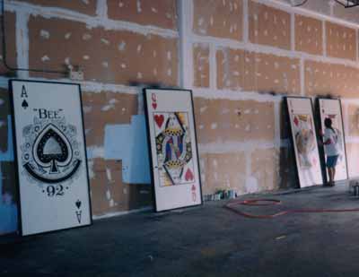 | Home Portfolio Inventory Art Galleries Broad and Cassel Children's Shows Churches Concert / Staging Corporate Sets / Business Theatre Disney Conference Room Exteriors Flooring Futuristic Set Game Shows Gaylord Palms High End Wood & Laminate Interiors JW Marriott Misc. Props Ripley's San Antonio Ripley's Time Square Scenic Painting Sculpted Sets Sesame Street Talk Show / News Anchor Set Theme / Amusement Parks Theme Party Sets Toys R Us Trade Show / Displays Wild Shapes |   Props This picture of an antique alter table has special meaning to me. Dolly Parton had a series pilot in Orlando and they couldn't find an old period alter table to match existing found pieces. They sent a P.A. over to me with a Polaroid and said they had an existing piece damaged the day of the shoot and needed one to blend in (in that afternoon). So, I hopped in the truck, drove to the local lumber yard picked out a bunch of found trim / detail items, designed this piece in my head on the way back to my shop. I started creating and doing the scenic myself because all of my crew were busy on other projects. Five and a half hours later I delivered this set piece personally in order for them to finish shooting that day.  We had to recreate a PepBoys AutoParts store on stage, so that they could shoot down on it to mimic the roof slamming down on the store at the end of the commercial.  When Universal Studios Florida called and said they had some ugly Rubbermaid Rolling bars that they wanted to hide we designed and built these Irish style pub units to plug right over the Rubbermaid Bars. You would of never know. The rear bars in picture 73 hide existing booths.  When Universal Studios Florida called and said they had some ugly Rubbermaid Rolling bars that they wanted to hide we designed and built these Irish style pub units to plug right over the Rubbermaid Bars. You would of never know. The rear bars in this picture hide existing booths.  Beautiful functional modular stair case with stained risers, spindles and railing, and paint grade side panels and trends.  We built this great podium for our IBM Corporate meeting. We stretched the aircraft cable so tight you can actually play it.   UPS Commercial 200012 x 14' Lighted Logo sign for corporate meeting/award show at the Hard Rock Café.  Enrique Iglesias Summer Jams 2000This 16' tall and 28' wide modular rising sunburst is a great backdrop for a stage or a free standing prop for a theme party.  FOX/Universal Multi Artist SpecialGREAT modular set. 11 - columns ranging from 14'- 24' with fabric windows for internal lighting and leme flame tips lit with MR16 and powered by a 20" high velocity fan. Backlit plexi podium/cabinet with P95frosted plexi face over steel frame with laminate top and drop wall.   Herbalife Trade ShowUnder lit plexi riser stair unit with black laminate finish 6'W x 8'D x 54"Tall  Home Shopping NetworkCustom radius cabinet for sales and display.  Cosmetic CommercialCustom built make up stations with silver bronzing powder paint, black laminate top with milk white plexi inlay with vanity lights around.  Christina Aguilera Summer Jams 2000These gorgeous modular high quality scenically painted and airbrushed pieces are standalone flats. They are great décor for any event for a day in paradise. 12 pieces from 5' x 7' to 9' x 15'.  WACX Telethon15 - 3 x 2 x 4 desk wraps for phone bank on telethon.  Tinkerbell's ChestCuston built scenically painted, jeweled chest used as a prop in a live show.  Zig ZagClose up of custom-built doors entering coliseum.  Zig ZagClose up of main entrance gates made of aluminum. Loose pin hinged for quick removal on casters and rolling side mounts.  Cars.Com CommercialWe built this café 50% scale garage with minature trees, etc. to use on a green screen gag where it was dropped on a car. We could change garage door to house entrance!  (Themed) Creative ServicesHow about these oversized playing cards. 4' x 8'. Poker anyone?  WACXDivine appointment set for WACX. How about these great balusters, columns, and pedestals. They are all on castes and easily roll on and off set for different shots. Faux concrete, granite and marble are featured. How about this high tech desk and cabinet to step you into the 21st century.   Weather DeskThis custom-rolling desk is going to be green screened and have live video projected on exposed area between cabinet and top.  ABC Logo SignWhen we were asked to create a high end looking logo sign that would light well externally and internally this is what we came up with. A 6' x 1' 3 dimensional sign with multicolor fiber optic rope lighting installed behind raised silver logo.  ABC Logo SignClose up of the ABC Logo Sign.   Church Street ChristmasRolling décor for mobile game show.  Making the Band ABC TV SeriesCustom built beds and cabinetry with laminate inlays and built in lighting.  Making the Band ABC TV SeriesCustom built laminate inlay peanut shaped desk with tape legs.  Making the Band ABC TV SeriesCustom built beds for the guys, laminate sides and headboard.  Tupperware Awards ShowClose up of under lit plexi and black laminate stairs accented with rope light border.  Creative ServicesCustom laminate and glass block bar units with neon shape behind glass on wheels. 8 units.  HSN Lessman CountersCustom built Connical table laminated with birchwood. Design has layered bullnose top and exterior door for access on casters.  HSN Lessman CountersCustom built curved cabinet with steel shelving with plexi glass inserts and a burl laminate cabinet with rear access door.  Premier Christmas SetAuthentic, oversized functional props and presents for outdoor themed display consisting of over 50 items and props.  SchweppsCenter piece consisting of shallow oval decorative pond around sculpted statue with fountain water fitting that recycles water over sculpture.  FOX/Universal Multi Artist Special2' square internally lit columns from 14 - 24' includes leme flame tip powered 20" fan dressed with 12" silver b